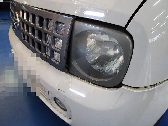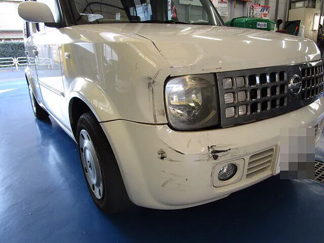 三鷹市在住のT様より、日産 キューブ 追突事故によるフロントバンパー修理 キズ・ヘコミの鈑金塗装の依頼をいただきました。