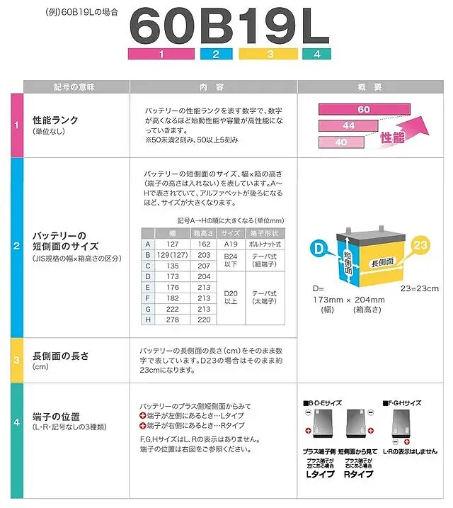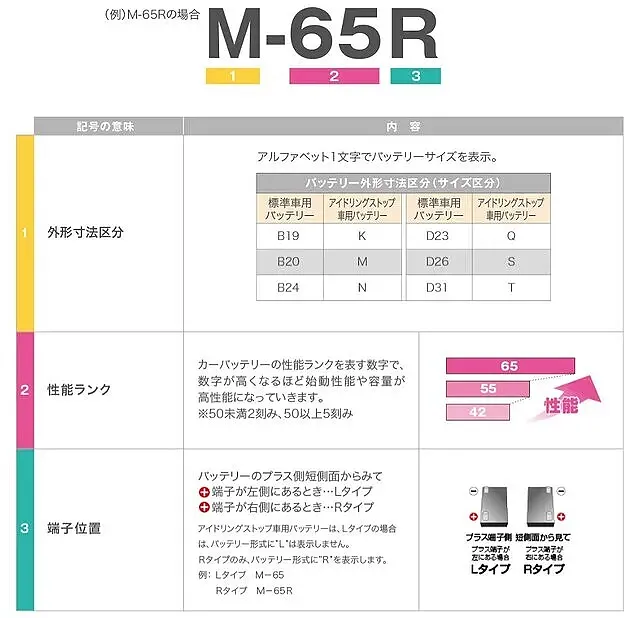 ハイブリッド車の国産車バッテリーは、頭のアルファベットと最後の4文字で型式やサイズを見分けることができます。