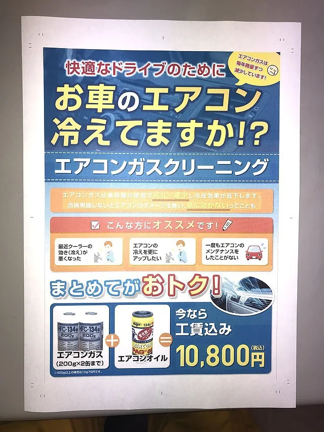弊社では、追加補充したエアコンガス(400gまで)+エアコンオイル(蛍光剤入り)+エアコンガスクリーニングをコミコミで工賃¥11,000(税込)にてご提供しております。「エアコンの調子がどうも....」あるいは「昨年よりなんかエアコンの効きが悪いなぁ~」と思われたら、ぜひともエアコン修理実績が豊富な当社にご相談ください。